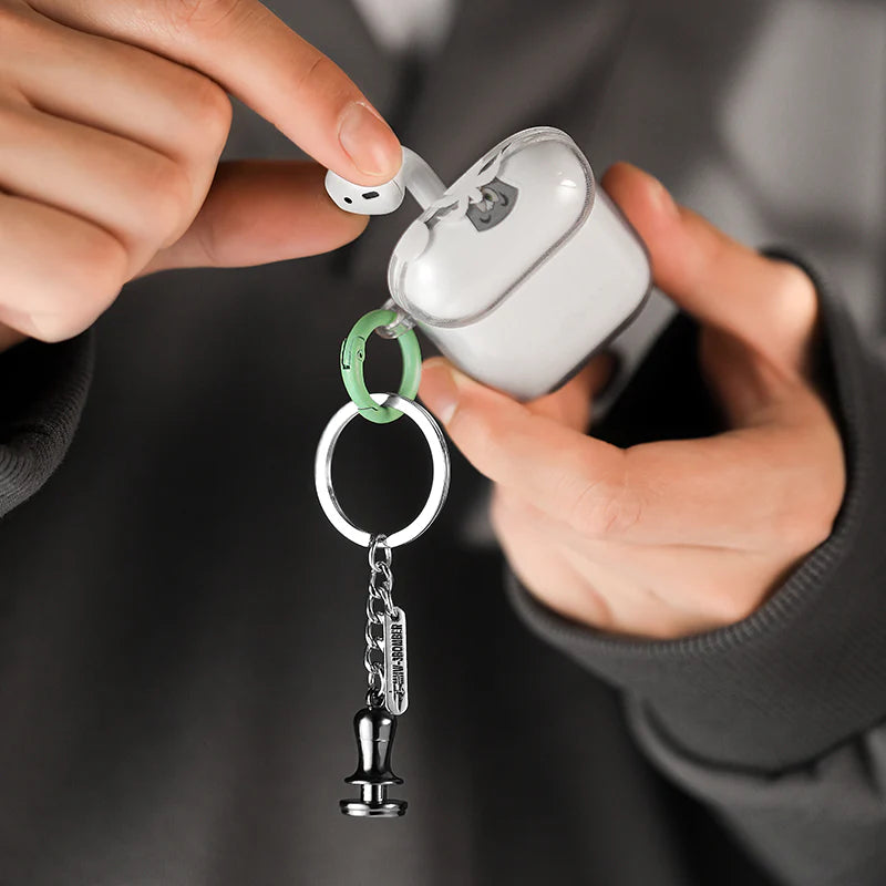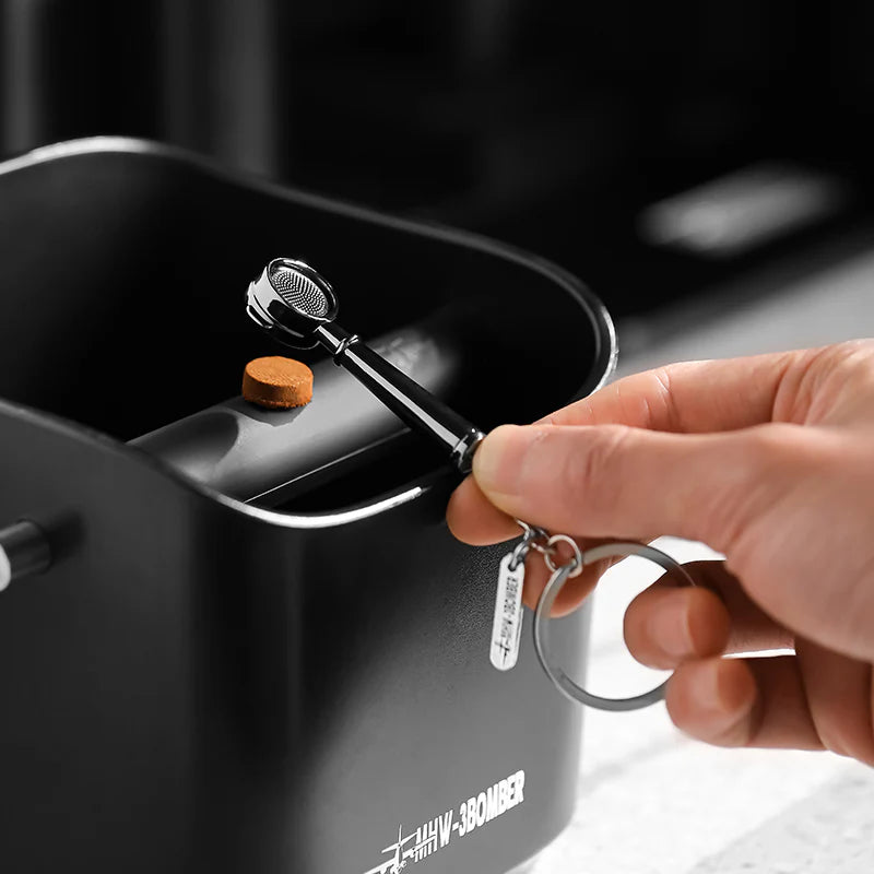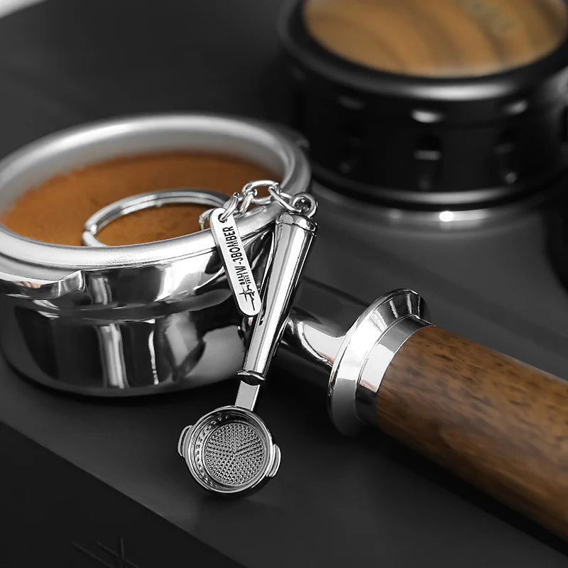 A decorative and tactile keychain featuring a realistic miniature brass or stainless steel portafilter, perfect for any espresso enthusiast.