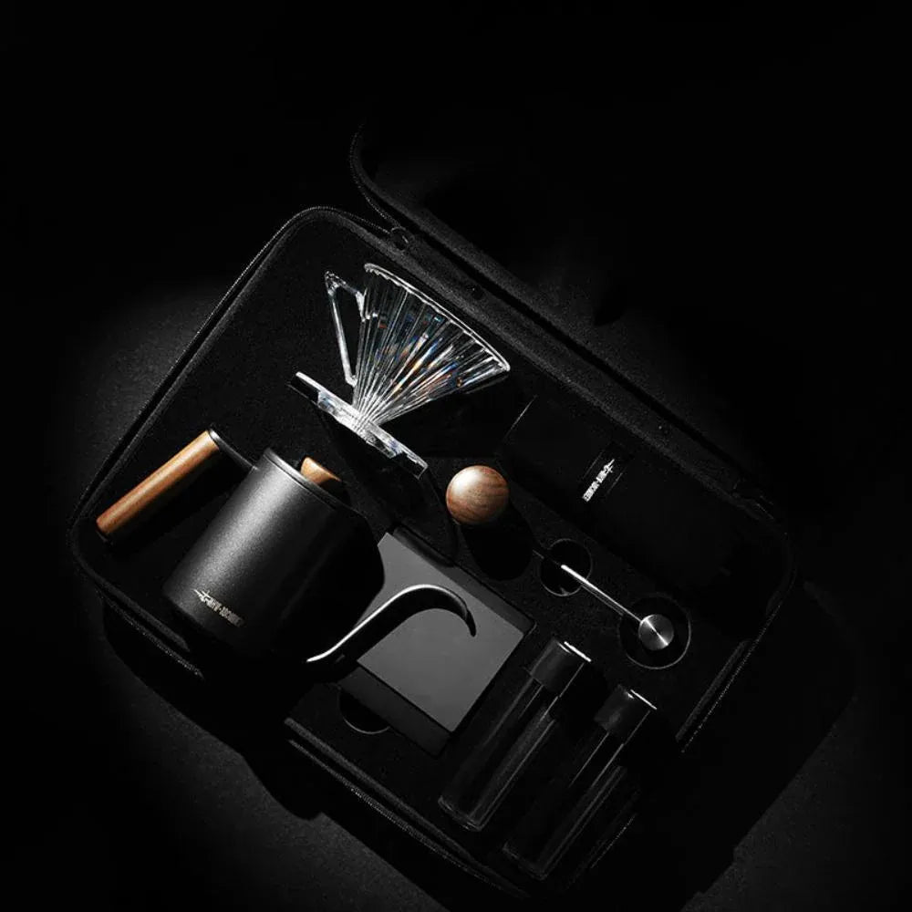 This compact, 8-piece set includes a manual grinder, mini scale, kettle, and dripper, all safely housed in a durable travel case for professional-quality outdoor brewing.